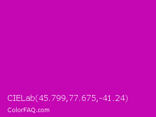 CIELab 45.799,77.675,-41.24 Color is a normal magenta color and the nearest color is Deep Magenta #cc00cc. Hex code #c406b3 and RGB value is rgb(196,6,179). In RGB color space, this color is composed of 77% red, 2% green, 70% blue, In CMYK color space, this color is composed of 0% cyan, 97% magenta, 9% yellow , 23% black , In HSL color space, this color has a hue angle of 305° , 94% saturation and 40% lightness.
