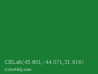 CIELab 45.801,-44.071,31.616 Color is a dark green color and the nearest color is La Salle Green #087830. Hex code #197d34 and RGB value is rgb(25,125,52). In RGB color space, this color is composed of 10% red, 49% green, 20% blue, In CMYK color space, this color is composed of 80% cyan, 0% magenta, 58% yellow , 51% black , In HSL color space, this color has a hue angle of 136° , 67% saturation and 29% lightness.
