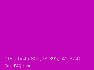 CIELab 45.802,78.395,-45.374 Color is a normal magenta color and the nearest color is Deep Magenta #cc00cc. Hex code #c205ba and RGB value is rgb(194,5,186). In RGB color space, this color is composed of 76% red, 2% green, 73% blue, In CMYK color space, this color is composed of 0% cyan, 97% magenta, 4% yellow , 24% black , In HSL color space, this color has a hue angle of 303° , 95% saturation and 39% lightness.