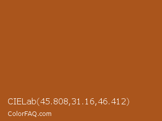 CIELab 45.808,31.16,46.412 Color is a normal orange color and the nearest color is Desert #ae6020. Hex code #aa551c and RGB value is rgb(170,85,28). In RGB color space, this color is composed of 67% red, 33% green, 11% blue, In CMYK color space, this color is composed of 0% cyan, 50% magenta, 84% yellow , 33% black , In HSL color space, this color has a hue angle of 24° , 72% saturation and 39% lightness.