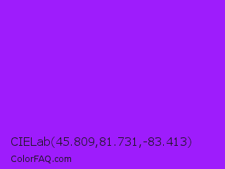 CIELab 45.809,81.731,-83.413 Color is a normal purple color and the nearest color is Veronica #a020f0. Hex code #9e1cfc and RGB value is rgb(158,28,252). In RGB color space, this color is composed of 62% red, 11% green, 99% blue, In CMYK color space, this color is composed of 37% cyan, 89% magenta, 0% yellow , 1% black , In HSL color space, this color has a hue angle of 275° , 97% saturation and 55% lightness.