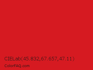 CIELab 45.832,67.657,47.11 Color is a normal red color and the nearest color is Maximum Red #d92121. Hex code #d61a21 and RGB value is rgb(214,26,33). In RGB color space, this color is composed of 84% red, 10% green, 13% blue, In CMYK color space, this color is composed of 0% cyan, 88% magenta, 85% yellow , 16% black , In HSL color space, this color has a hue angle of 358° , 78% saturation and 47% lightness.