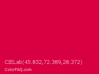CIELab 45.832,72.389,28.372 Color is a normal rose color and the nearest color is Rich Carmine #d70040. Hex code #d90042 and RGB value is rgb(217,0,66). In RGB color space, this color is composed of 85% red, 0% green, 26% blue, In CMYK color space, this color is composed of 0% cyan, 100% magenta, 70% yellow , 15% black , In HSL color space, this color has a hue angle of 342° , 100% saturation and 43% lightness.