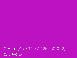 CIELab 45.834,77.426,-50.052 Color is a normal magenta color and the nearest color is Deep Magenta #cc00cc. Hex code #bd12c2 and RGB value is rgb(189,18,194). In RGB color space, this color is composed of 74% red, 7% green, 76% blue, In CMYK color space, this color is composed of 3% cyan, 91% magenta, 0% yellow , 24% black , In HSL color space, this color has a hue angle of 298° , 83% saturation and 42% lightness.