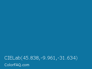 CIELab 45.838,-9.961,-31.634 Color is a normal blue color and the nearest color is Allports #0076a3. Hex code #0d74a1 and RGB value is rgb(13,116,161). In RGB color space, this color is composed of 5% red, 45% green, 63% blue, In CMYK color space, this color is composed of 92% cyan, 28% magenta, 0% yellow , 37% black , In HSL color space, this color has a hue angle of 198° , 85% saturation and 34% lightness.