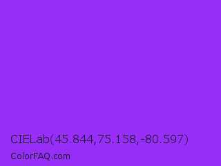 CIELab 45.844,75.158,-80.597 Color is a normal purple color and the nearest color is Veronica #a020f0. Hex code #962ef7 and RGB value is rgb(150,46,247). In RGB color space, this color is composed of 59% red, 18% green, 97% blue, In CMYK color space, this color is composed of 39% cyan, 81% magenta, 0% yellow , 3% black , In HSL color space, this color has a hue angle of 271° , 93% saturation and 57% lightness.
