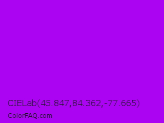 CIELab 45.847,84.362,-77.665 Color is a normal purple color and the nearest color is Vivid Violet #9f00ff. Hex code #ab04f2 and RGB value is rgb(171,4,242). In RGB color space, this color is composed of 67% red, 2% green, 95% blue, In CMYK color space, this color is composed of 29% cyan, 98% magenta, 0% yellow , 5% black , In HSL color space, this color has a hue angle of 282° , 97% saturation and 48% lightness.