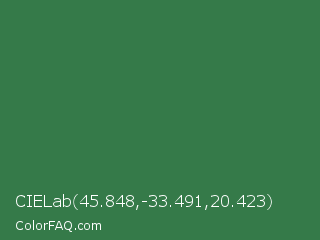 CIELab 45.848,-33.491,20.423 Color is a normal green color and the nearest color is Goblin #3d7d52. Hex code #357a49 and RGB value is rgb(53,122,73). In RGB color space, this color is composed of 21% red, 48% green, 29% blue, In CMYK color space, this color is composed of 57% cyan, 0% magenta, 40% yellow , 52% black , In HSL color space, this color has a hue angle of 137° , 39% saturation and 34% lightness.
