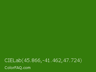 CIELab 45.866,-41.462,47.724 Color is a dark green color and the nearest color is Bilbao #327c14. Hex code #347c0b and RGB value is rgb(52,124,11). In RGB color space, this color is composed of 20% red, 49% green, 4% blue, In CMYK color space, this color is composed of 58% cyan, 0% magenta, 91% yellow , 51% black , In HSL color space, this color has a hue angle of 98° , 84% saturation and 26% lightness.