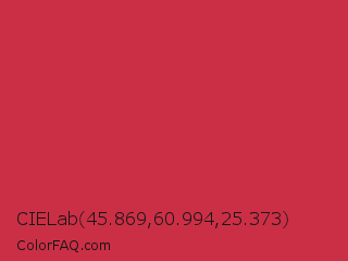 CIELab 45.869,60.994,25.373 Color is a normal red color and the nearest color is French Raspberry #c72c48. Hex code #cb2f46 and RGB value is rgb(203,47,70). In RGB color space, this color is composed of 80% red, 18% green, 27% blue, In CMYK color space, this color is composed of 0% cyan, 77% magenta, 66% yellow , 20% black , In HSL color space, this color has a hue angle of 351° , 62% saturation and 49% lightness.