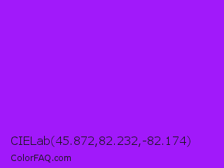 CIELab 45.872,82.232,-82.174 Color is a normal purple color and the nearest color is Veronica #a020f0. Hex code #a119fa and RGB value is rgb(161,25,250). In RGB color space, this color is composed of 63% red, 10% green, 98% blue, In CMYK color space, this color is composed of 36% cyan, 90% magenta, 0% yellow , 2% black , In HSL color space, this color has a hue angle of 276° , 96% saturation and 54% lightness.