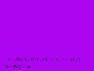 CIELab 45.876,84.273,-77.617 Color is a normal purple color and the nearest color is Vivid Violet #9f00ff. Hex code #ab05f2 and RGB value is rgb(171,5,242). In RGB color space, this color is composed of 67% red, 2% green, 95% blue, In CMYK color space, this color is composed of 29% cyan, 98% magenta, 0% yellow , 5% black , In HSL color space, this color has a hue angle of 282° , 96% saturation and 48% lightness.