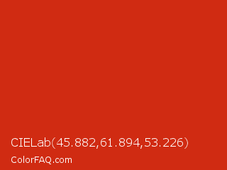 CIELab 45.882,61.894,53.226 Color is a normal red color and the nearest color is Thunderbird #c02b18. Hex code #d02b12 and RGB value is rgb(208,43,18). In RGB color space, this color is composed of 82% red, 17% green, 7% blue, In CMYK color space, this color is composed of 0% cyan, 79% magenta, 91% yellow , 18% black , In HSL color space, this color has a hue angle of 8° , 84% saturation and 44% lightness.