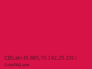 CIELab 45.885,70.192,25.231 Color is a normal rose color and the nearest color is Crimson #dc143c. Hex code #d61247 and RGB value is rgb(214,18,71). In RGB color space, this color is composed of 84% red, 7% green, 28% blue, In CMYK color space, this color is composed of 0% cyan, 92% magenta, 67% yellow , 16% black , In HSL color space, this color has a hue angle of 344° , 84% saturation and 45% lightness.