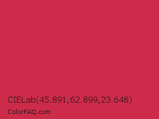 CIELab 45.891,62.899,23.648 Color is a normal red color and the nearest color is French Raspberry #c72c48. Hex code #cd2b49 and RGB value is rgb(205,43,73). In RGB color space, this color is composed of 80% red, 17% green, 29% blue, In CMYK color space, this color is composed of 0% cyan, 79% magenta, 64% yellow , 20% black , In HSL color space, this color has a hue angle of 349° , 65% saturation and 49% lightness.