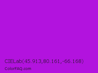 CIELab 45.913,80.161,-66.168 Color is a normal purple color and the nearest color is Vivid Mulberry #b80ce3. Hex code #b213de and RGB value is rgb(178,19,222). In RGB color space, this color is composed of 70% red, 7% green, 87% blue, In CMYK color space, this color is composed of 20% cyan, 91% magenta, 0% yellow , 13% black , In HSL color space, this color has a hue angle of 287° , 84% saturation and 47% lightness.