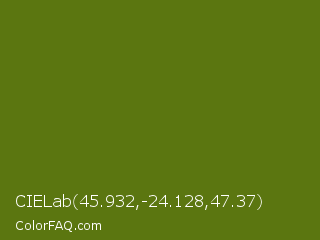 CIELab 45.932,-24.128,47.37 Color is a dark lime color and the nearest color is Avocado #568203. Hex code #5b7610 and RGB value is rgb(91,118,16). In RGB color space, this color is composed of 36% red, 46% green, 6% blue, In CMYK color space, this color is composed of 23% cyan, 0% magenta, 86% yellow , 54% black , In HSL color space, this color has a hue angle of 76° , 76% saturation and 26% lightness.