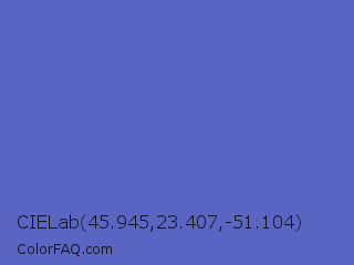 CIELab 45.945,23.407,-51.104 Color is a normal blue color and the nearest color is Indigo #4f69c6. Hex code #5a64c3 and RGB value is rgb(90,100,195). In RGB color space, this color is composed of 35% red, 39% green, 76% blue, In CMYK color space, this color is composed of 54% cyan, 49% magenta, 0% yellow , 24% black , In HSL color space, this color has a hue angle of 234° , 47% saturation and 56% lightness.