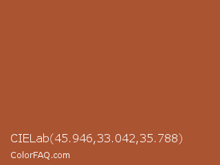CIELab 45.946,33.042,35.788 Color is a normal orange color and the nearest color is Paarl #a65529. Hex code #ab5432 and RGB value is rgb(171,84,50). In RGB color space, this color is composed of 67% red, 33% green, 20% blue, In CMYK color space, this color is composed of 0% cyan, 51% magenta, 71% yellow , 33% black , In HSL color space, this color has a hue angle of 17° , 55% saturation and 43% lightness.