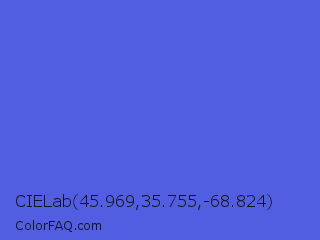 CIELab 45.969,35.755,-68.824 Color is a normal blue color and the nearest color is Royal Blue #4169e1. Hex code #515ee2 and RGB value is rgb(81,94,226). In RGB color space, this color is composed of 32% red, 37% green, 89% blue, In CMYK color space, this color is composed of 64% cyan, 58% magenta, 0% yellow , 11% black , In HSL color space, this color has a hue angle of 235° , 71% saturation and 60% lightness.