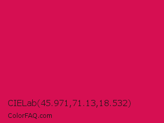 CIELab 45.971,71.13,18.532 Color is a normal rose color and the nearest color is Debian Red #d70a53. Hex code #d60f52 and RGB value is rgb(214,15,82). In RGB color space, this color is composed of 84% red, 6% green, 32% blue, In CMYK color space, this color is composed of 0% cyan, 93% magenta, 62% yellow , 16% black , In HSL color space, this color has a hue angle of 340° , 87% saturation and 45% lightness.
