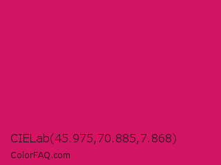 CIELab 45.975,70.885,7.868 Color is a normal rose color and the nearest color is Dogwood Rose #d71868. Hex code #d31463 and RGB value is rgb(211,20,99). In RGB color space, this color is composed of 83% red, 8% green, 39% blue, In CMYK color space, this color is composed of 0% cyan, 91% magenta, 53% yellow , 17% black , In HSL color space, this color has a hue angle of 335° , 83% saturation and 45% lightness.