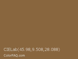 CIELab 45.98,9.508,28.088 Color is a normal orange color and the nearest color is Raw Umber #826644. Hex code #8a663e and RGB value is rgb(138,102,62). In RGB color space, this color is composed of 54% red, 40% green, 24% blue, In CMYK color space, this color is composed of 0% cyan, 26% magenta, 55% yellow , 46% black , In HSL color space, this color has a hue angle of 32° , 38% saturation and 39% lightness.