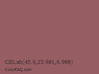 CIELab 45.9,23.981,6.988 Color is a normal red color and the nearest color is Au Chico #97605d. Hex code #965d62 and RGB value is rgb(150,93,98). In RGB color space, this color is composed of 59% red, 36% green, 38% blue, In CMYK color space, this color is composed of 0% cyan, 38% magenta, 35% yellow , 41% black , In HSL color space, this color has a hue angle of 355° , 23% saturation and 48% lightness.