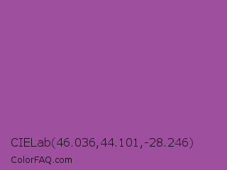 CIELab 46.036,44.101,-28.246 Color is a normal magenta color and the nearest color is Purpureus #9a4eae. Hex code #9e4f9d and RGB value is rgb(158,79,157). In RGB color space, this color is composed of 62% red, 31% green, 62% blue, In CMYK color space, this color is composed of 0% cyan, 50% magenta, 1% yellow , 38% black , In HSL color space, this color has a hue angle of 301° , 33% saturation and 46% lightness.