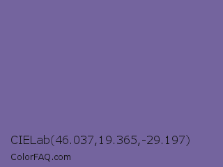 CIELab 46.037,19.365,-29.197 Color is a normal indigo color and the nearest color is Kimberly #736c9f. Hex code #74649e and RGB value is rgb(116,100,158). In RGB color space, this color is composed of 45% red, 39% green, 62% blue, In CMYK color space, this color is composed of 27% cyan, 37% magenta, 0% yellow , 38% black , In HSL color space, this color has a hue angle of 257° , 23% saturation and 51% lightness.