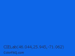 CIELab 46.044,25.945,-71.062 Color is a normal blue color and the nearest color is Bright Navy Blue #1974d2. Hex code #0d66e6 and RGB value is rgb(13,102,230). In RGB color space, this color is composed of 5% red, 40% green, 90% blue, In CMYK color space, this color is composed of 94% cyan, 56% magenta, 0% yellow , 10% black , In HSL color space, this color has a hue angle of 215° , 89% saturation and 48% lightness.