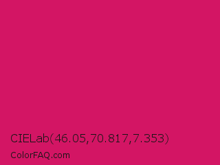 CIELab 46.05,70.817,7.353 Color is a normal rose color and the nearest color is Dogwood Rose #d71868. Hex code #d31564 and RGB value is rgb(211,21,100). In RGB color space, this color is composed of 83% red, 8% green, 39% blue, In CMYK color space, this color is composed of 0% cyan, 90% magenta, 53% yellow , 17% black , In HSL color space, this color has a hue angle of 335° , 82% saturation and 45% lightness.