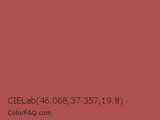 CIELab 46.068,37.357,19.8 Color is a normal red color and the nearest color is Rose Vale #ab4e52. Hex code #ad514e and RGB value is rgb(173,81,78). In RGB color space, this color is composed of 68% red, 32% green, 31% blue, In CMYK color space, this color is composed of 0% cyan, 53% magenta, 55% yellow , 32% black , In HSL color space, this color has a hue angle of 2° , 38% saturation and 49% lightness.
