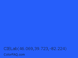 CIELab 46.069,39.723,-82.224 Color is a normal blue color and the nearest color is Blue Crayola #1f75fe. Hex code #265efa and RGB value is rgb(38,94,250). In RGB color space, this color is composed of 15% red, 37% green, 98% blue, In CMYK color space, this color is composed of 85% cyan, 62% magenta, 0% yellow , 2% black , In HSL color space, this color has a hue angle of 224° , 95% saturation and 56% lightness.