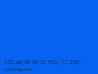 CIELab 46.06,31.932,-77.226 Color is a normal blue color and the nearest color is Blue Ribbon #0066ff. Hex code #0663f1 and RGB value is rgb(6,99,241). In RGB color space, this color is composed of 2% red, 39% green, 95% blue, In CMYK color space, this color is composed of 98% cyan, 59% magenta, 0% yellow , 5% black , In HSL color space, this color has a hue angle of 216° , 95% saturation and 48% lightness.