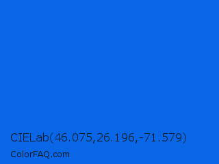 CIELab 46.075,26.196,-71.579 Color is a normal blue color and the nearest color is Blue Ribbon #0066ff. Hex code #0866e7 and RGB value is rgb(8,102,231). In RGB color space, this color is composed of 3% red, 40% green, 91% blue, In CMYK color space, this color is composed of 97% cyan, 56% magenta, 0% yellow , 9% black , In HSL color space, this color has a hue angle of 215° , 93% saturation and 47% lightness.