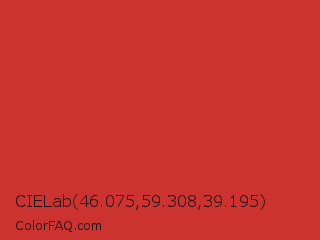 CIELab 46.075,59.308,39.195 Color is a normal red color and the nearest color is Persian Red #cc3333. Hex code #cc322f and RGB value is rgb(204,50,47). In RGB color space, this color is composed of 80% red, 20% green, 18% blue, In CMYK color space, this color is composed of 0% cyan, 75% magenta, 77% yellow , 20% black , In HSL color space, this color has a hue angle of 1° , 63% saturation and 49% lightness.