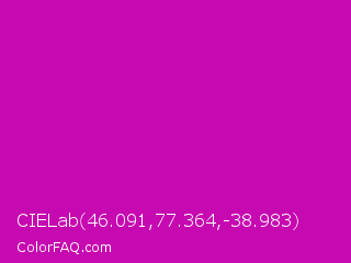CIELab 46.091,77.364,-38.983 Color is a normal magenta color and the nearest color is Deep Magenta #cc00cc. Hex code #c609b0 and RGB value is rgb(198,9,176). In RGB color space, this color is composed of 78% red, 4% green, 69% blue, In CMYK color space, this color is composed of 0% cyan, 95% magenta, 11% yellow , 22% black , In HSL color space, this color has a hue angle of 307° , 91% saturation and 41% lightness.