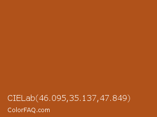 CIELab 46.095,35.137,47.849 Color is a normal orange color and the nearest color is Fiery Orange #b35213. Hex code #b0521a and RGB value is rgb(176,82,26). In RGB color space, this color is composed of 69% red, 32% green, 10% blue, In CMYK color space, this color is composed of 0% cyan, 53% magenta, 85% yellow , 31% black , In HSL color space, this color has a hue angle of 22° , 74% saturation and 40% lightness.