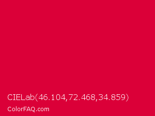 CIELab 46.104,72.468,34.859 Color is a normal red color and the nearest color is Rich Carmine #d70040. Hex code #db0038 and RGB value is rgb(219,0,56). In RGB color space, this color is composed of 86% red, 0% green, 22% blue, In CMYK color space, this color is composed of 0% cyan, 100% magenta, 74% yellow , 14% black , In HSL color space, this color has a hue angle of 345° , 100% saturation and 43% lightness.