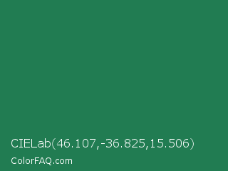 CIELab 46.107,-36.825,15.506 Color is a normal green color and the nearest color is Eucalyptus #278a5b. Hex code #217c52 and RGB value is rgb(33,124,82). In RGB color space, this color is composed of 13% red, 49% green, 32% blue, In CMYK color space, this color is composed of 73% cyan, 0% magenta, 34% yellow , 51% black , In HSL color space, this color has a hue angle of 152° , 58% saturation and 31% lightness.
