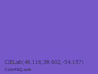 CIELab 46.116,38.602,-54.157 Color is a normal indigo color and the nearest color is Fuchsia Blue #7a58c1. Hex code #7859c9 and RGB value is rgb(120,89,201). In RGB color space, this color is composed of 47% red, 35% green, 79% blue, In CMYK color space, this color is composed of 40% cyan, 56% magenta, 0% yellow , 21% black , In HSL color space, this color has a hue angle of 257° , 51% saturation and 57% lightness.