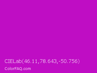 CIELab 46.11,78.643,-50.756 Color is a normal magenta color and the nearest color is Deep Magenta #cc00cc. Hex code #bf0dc4 and RGB value is rgb(191,13,196). In RGB color space, this color is composed of 75% red, 5% green, 77% blue, In CMYK color space, this color is composed of 3% cyan, 93% magenta, 0% yellow , 23% black , In HSL color space, this color has a hue angle of 298° , 88% saturation and 41% lightness.