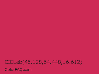 CIELab 46.128,64.448,16.612 Color is a normal rose color and the nearest color is Dingy Dungeon #c53151. Hex code #ce2955 and RGB value is rgb(206,41,85). In RGB color space, this color is composed of 81% red, 16% green, 33% blue, In CMYK color space, this color is composed of 0% cyan, 80% magenta, 59% yellow , 19% black , In HSL color space, this color has a hue angle of 344° , 67% saturation and 48% lightness.