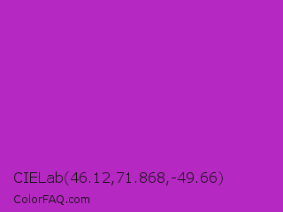 CIELab 46.12,71.868,-49.66 Color is a normal magenta color and the nearest color is Steel Pink #cc33cc. Hex code #b628c2 and RGB value is rgb(182,40,194). In RGB color space, this color is composed of 71% red, 16% green, 76% blue, In CMYK color space, this color is composed of 6% cyan, 79% magenta, 0% yellow , 24% black , In HSL color space, this color has a hue angle of 295° , 66% saturation and 46% lightness.