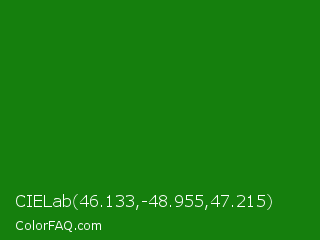 CIELab 46.133,-48.955,47.215 Color is a dark green color and the nearest color is India Green #138808. Hex code #157f0d and RGB value is rgb(21,127,13). In RGB color space, this color is composed of 8% red, 50% green, 5% blue, In CMYK color space, this color is composed of 83% cyan, 0% magenta, 90% yellow , 50% black , In HSL color space, this color has a hue angle of 116° , 81% saturation and 27% lightness.