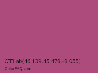 CIELab 46.139,45.478,-8.055 Color is a normal rose color and the nearest color is Mystic Maroon #ad4379. Hex code #ad4b7c and RGB value is rgb(173,75,124). In RGB color space, this color is composed of 68% red, 29% green, 49% blue, In CMYK color space, this color is composed of 0% cyan, 57% magenta, 28% yellow , 32% black , In HSL color space, this color has a hue angle of 330° , 40% saturation and 49% lightness.