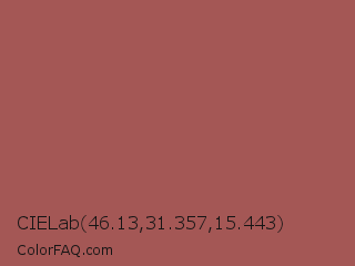 CIELab 46.13,31.357,15.443 Color is a normal red color and the nearest color is Redwood #a45a52. Hex code #a45755 and RGB value is rgb(164,87,85). In RGB color space, this color is composed of 64% red, 34% green, 33% blue, In CMYK color space, this color is composed of 0% cyan, 47% magenta, 48% yellow , 36% black , In HSL color space, this color has a hue angle of 2° , 32% saturation and 49% lightness.