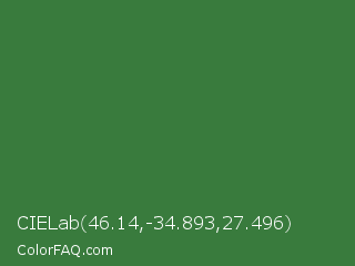 CIELab 46.14,-34.893,27.496 Color is a normal green color and the nearest color is Killarney #3a6a47. Hex code #397b3d and RGB value is rgb(57,123,61). In RGB color space, this color is composed of 22% red, 48% green, 24% blue, In CMYK color space, this color is composed of 54% cyan, 0% magenta, 50% yellow , 52% black , In HSL color space, this color has a hue angle of 124° , 37% saturation and 35% lightness.