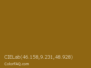CIELab 46.158,9.231,48.928 Color is a normal orange color and the nearest color is Corn Harvest #8b6b0b. Hex code #8f6612 and RGB value is rgb(143,102,18). In RGB color space, this color is composed of 56% red, 40% green, 7% blue, In CMYK color space, this color is composed of 0% cyan, 29% magenta, 87% yellow , 44% black , In HSL color space, this color has a hue angle of 40° , 78% saturation and 32% lightness.